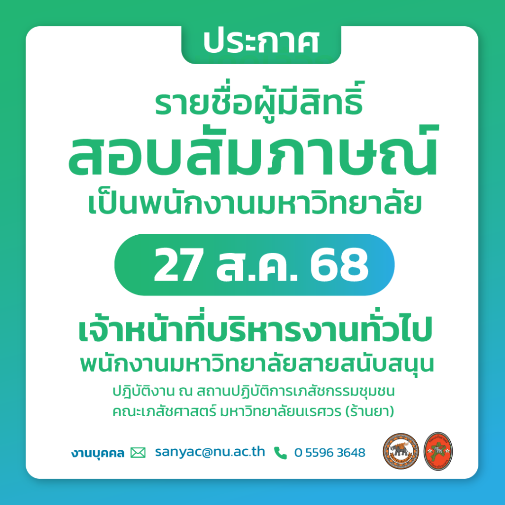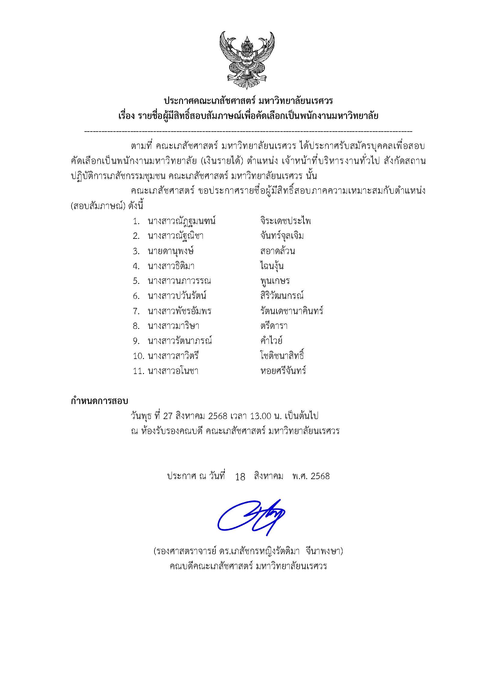 ประกาศคณะเภสัชศาสตร์ มหาวิทยาลัยนเรศวร เรื่อง รายชื่อผู้มีสิทธิ์สอบสัมภาษณ์เป็นพนักงานมหาวิทยาลัย