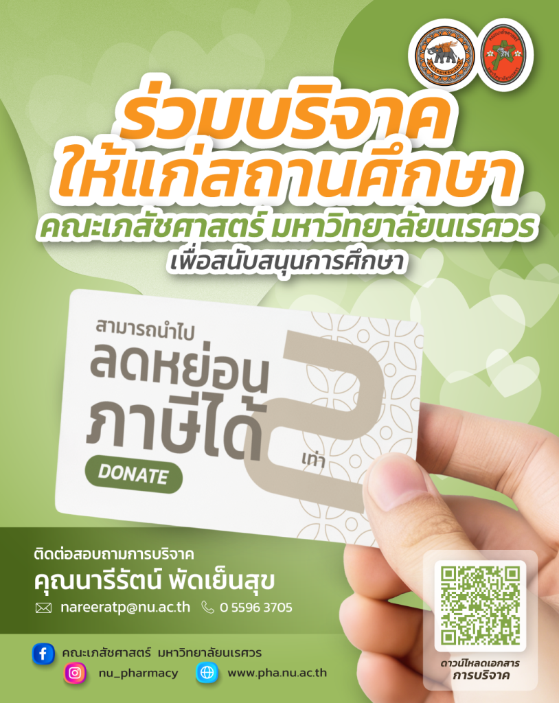 ขอเชิญร่วมเป็นส่วนหนึ่งในการบริจาคให้แก่สถานศึกษาคณะเภสัชศาสตร์ มหาวิทยาลัยนเรศวร เพื่อสนับสนุนการศึกษา โดยสามารถนำไปใช้ลดหย่อนภาษีได้ 2 เท่า คลิกดาวน์โหลดเอกสาร