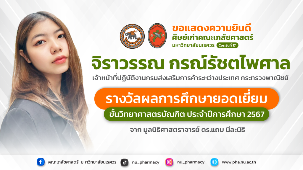 ขอแสดงความยินดี จิราวรรณ กรณ์รัชตไพศาล เจ้าหน้าที่ปฏิบัติงานกรมส่งเสริมการค้าระหว่างประเทศ กระทรวงพาณิชย์ ศิษย์เก่าคณะเภสัชศาสตร์ Cos รุ่นที่ 17 ได้รับรางวัลผลการศึกษายอดเยี่ยม ขั้นวิทยาศาสตรบัณฑิต ประจำปีการศึกษา 2567 จาก มูลนิธิศาสตราจารย์ ดร.แถบ นีละนิธิ