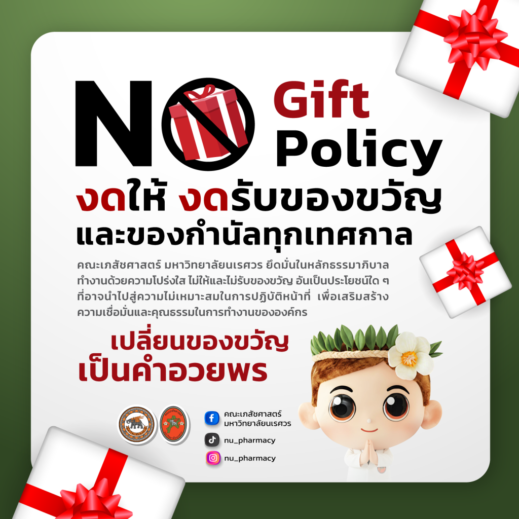 คณะเภสัชศาสตร์ มหาวิทยาลัยนเรศวร ยึดมั่นในหลักธรรมาภิบาล ทำงานด้วยความโปร่งใส ไม่ให้และไม่รับของขวัญ อันเป็นประโยชน์ใด ๆ ที่อาจนำไปสู่ความไม่เหมาะสมในการปฏิบัติหน้าที่ เพื่อเสริมสร้าง ความเชื่อมั่นและคุณธรรมในการทำงานขององค์กร