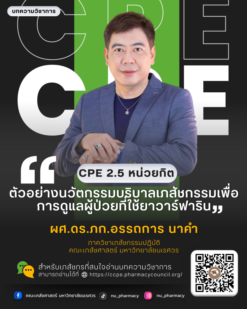 ชื่อบทความ: ตัวอย่างนวัตกรรมบริบาลเภสัชกรรมเพื่อการดูแลผู้ป่วยที่ใช้ยาวาร์ฟาริน (Examples of Innovative Pharmaceutical Care Approaches in the Management of Patients on Warfarin Therapy) ภาควิชาเภสัชกรรมปฏิบัติ คณะเภสัชศาสตร์ มหาวิทยาลัยนเรศวร